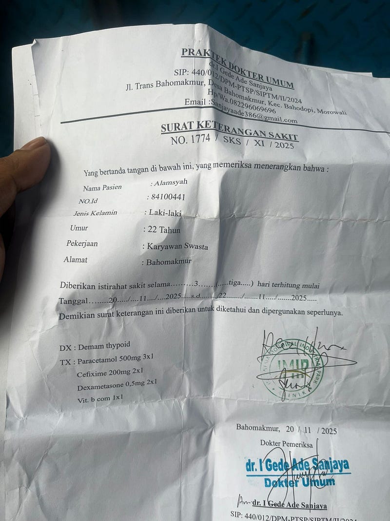 Pada tanggal 20 November 2025 seorang buruh bernama Alamsyah membuat Surat Keterangan Sakit (SKS) di klinik IMIP. Namun, tak sempat meng-acc-nya, ia langsung pergi ke Masamba, Sulawesi Selatan.
