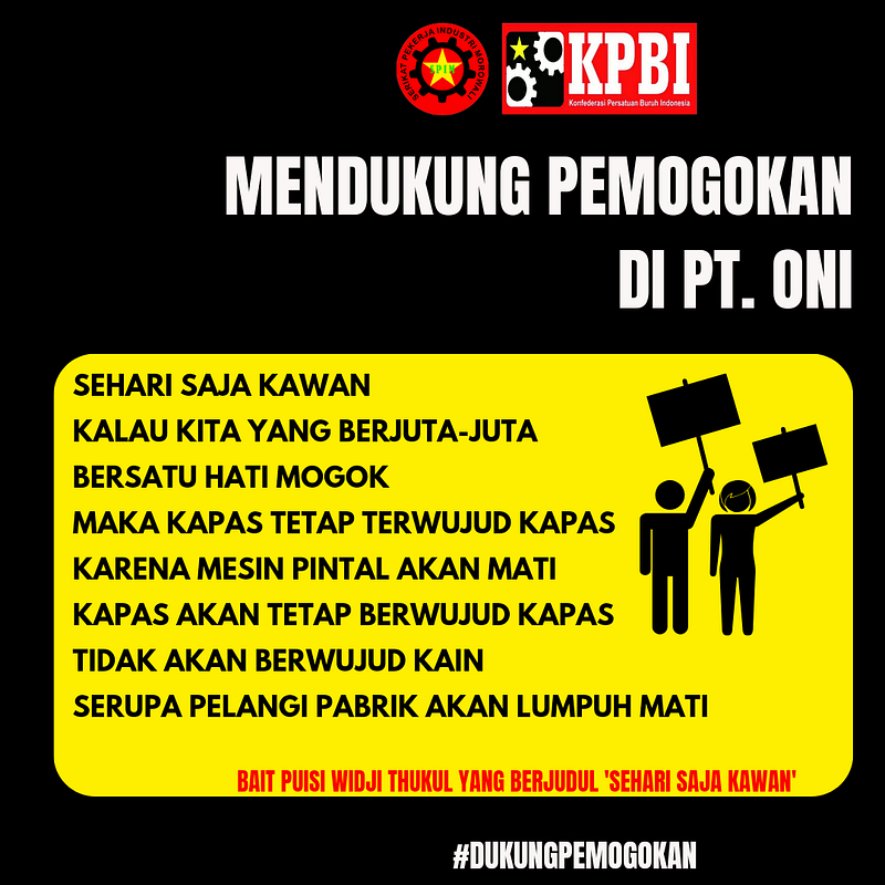 Mendengar kabar pemogokan dari kawan-kawan Pimpinan Serikat Pekerja (PSP) Serikat Pekerja Nasional (SPN) PT. Oracle Nickel Industri (ONI), kami tentu saja mendukung sepenuhnya. Sebagai sesama kawan serikat pekerja memang adalah suatu kewajiban saling mendukung.