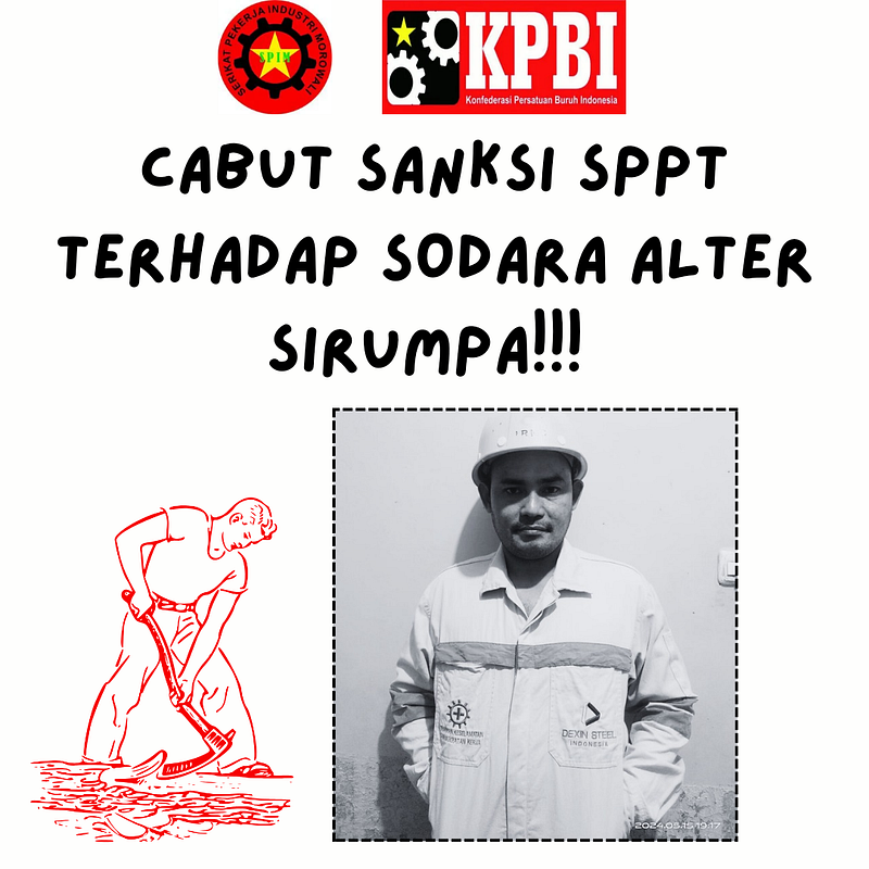 Dengan dalih penegakkan Peraturan Perusahaan, seorang buruh di PT. Dexin Steel Indonesia (DSI) kawasan IMIP mendapatkan sanksi Surat Peringatan Pertama dan Terakhir (SPPT). Buruh yang dimaksud bernama Alter Sirumpa.