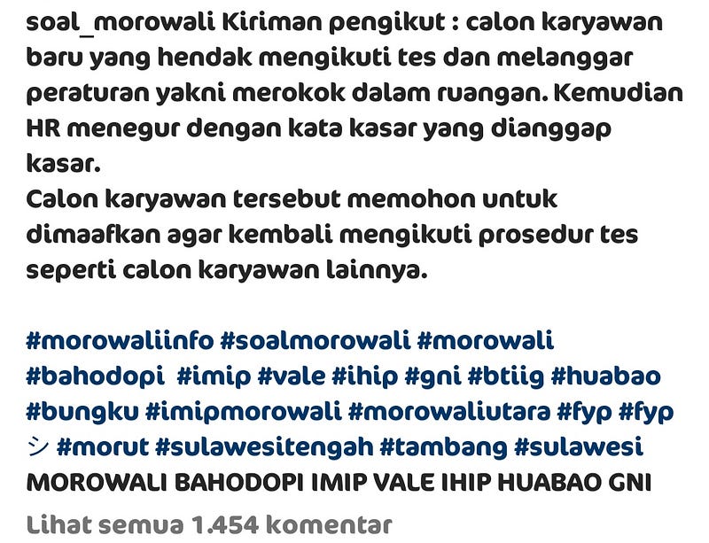 Terbelahnya sikap netizen tersebut setidaknya terlihat dalam akun IG soal_morowali. Komentar netizen di akun tersebut paling-tidak sampai berjumlah 1.454.