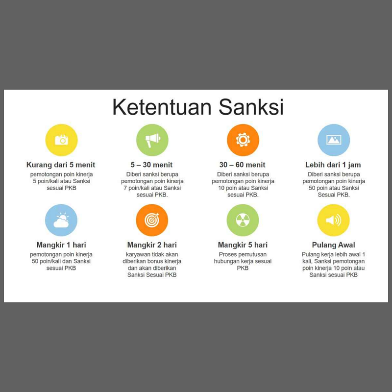 – Untuk terlambat <5 menit: Maksimal 5 poin kinerja atau SP1 untuk 2 kali keterlambatan dalam sebulan sesuai PKB.